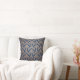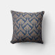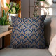 The design features an elegant damask pattern with a regal, vintage feel. The backdrop is a rich, deep blue, creating a striking contrast with the intricate gold motifs that adorn it. The pattern consists of stylised floral elements arranged in a symmetric, repeating layout, forming an eye-catching visual rhythm. Each floral motif is framed by curved, sweeping lines that converge to create an almost three-dimensional effect, adding depth and sophistication to the design. This classic yet luxurious pattern is perfect for a throw pillow, adding a touch of opulence and timeless elegance to any living space.