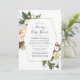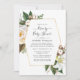 Floral drive through bridal or baby shower invitation featuring blush pink peonies, wild herbs, cotton and lilies with a gold geometric frame.