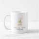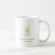 Elegant logo mug for hair salons or hairstylists features a pair of scissors in faux gold foil embellished with flowers. Personalise with two lines of custom text beneath in black lettering, perfect for your salon name.
