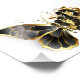 Gold flower butterfly with black jewellery orchid, decorated with gold leaves on white background.