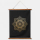 Stylish wood topped wall tapestry features large gold flower shape mandala on black background