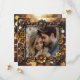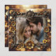 Romantic wedding Save the Date cards. Steampunk themed with gold metal gears, flowers and a gold bokeh background. Upload your favourite picture in the personalise area and edit the text on the back to add your own wedding info.