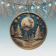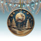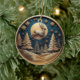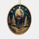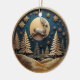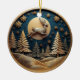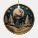 This round ceramic reindeer ornament features an elegant gold coloured frame that encircles a gold festive design. The background showcases a serene Christmas snowy night scene, with a dark blue sky filled with snowflakes. Below, a picturesque winter snow landscape with trees is softly illuminated by the glow of the moon. Gold deer with antlers gracefully flying in front of a full moon adds a touch of magic and Xmas holiday spirit to the ornament. Same Image is on the front and back. This ensures that no matter how the ornament turns, it always looks festive and complete. 🦌🎄