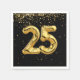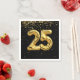 Gold mylar party balloons on black with gold star confetti for 25th birthday.