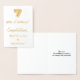 This gold foil wedding anniversary card design features a message like "7 years of marriage! Congratulations, Betty-Lou & Andrew!" on the front. The married couple’s names ("Betty-Lou & Andrew") can be changed to personalise the card. The inside features a customisable message like "May your 7th wedding anniversary be a happy and joyful one!". It could be given to a married couple who are celebrating their seventh wedding anniversary. [~Z0000048]