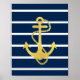 Poster, print with a gold foil anchor sign on navy blue striped background. This nautical print will be the perfect decor on your walls with it's modern style.