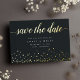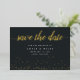 Simple and elegant save the date cards notify your guests of your upcoming wedding in timeless style. Rich charcoal black cards feature "save the date" in calligraphy script lettering, with your names, wedding date and location beneath in classic white serif type, and a sprinkle of golden confetti across the bottom. Add additional information, like your wedding website, to the reverse side in white lettering on a black background.