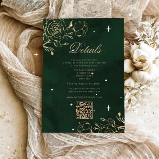 For an enhanced presentation, we recommend layering the invitation over a deep emerald green card background — the rich colour brings out the gold tones and adds a dramatic, elegant effect that will truly captivate your guests.
