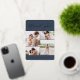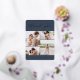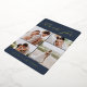 Elegant wedding thank you cards feature four photos arranged in a grid collage layout on a rich navy blue background. "Thank You" appears at the top in chic gold foil calligraphy script, with your names along the bottom in classic block lettering. Add a personal message and signature to the back.