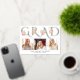 Gold foil GRAD typography photo graduation announcement. It features the word "GRAD" in a decorative font in gold foil, bouquets of pink roses and three photos. The backside features a pattern of white graduation caps on gold.