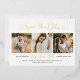 A glamourous gold foil heart calligraphy script save the date featuring three customisable engagement photo panels. The shimmering foil lettering adds a luxurious touch perfect for formal or garden weddings. Personalise with your names, date, location, and wedding website URL to create a stunning first impression for your guests.