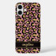 Customize this gold foil leopard print on a pink brushed metallic background iPhone 16 plus case with your your name in a trendy modern script font in a coordinating gold on black. So chic!