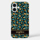Customize this gold foil leopard print on a teal brushed metallic background iPhone 16 case with your your name in a trendy modern script font in a coordinating gold on black. So chic!