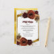 This wedding menu features rustic oil painted burgundy earthy toned autumn fall flowers over greenery and pampas grass with an elegant gold foliage frame and background.
