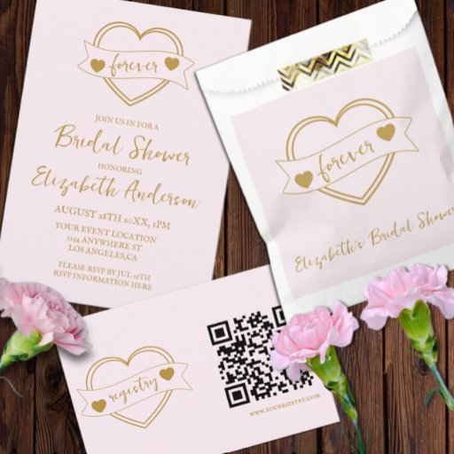 Celebrate love with this trendy gold and blush pink bridal shower collection. Features gold hearts and a ribbon identifying 'forever'