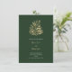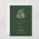 An elegant dark green wedding invitation showcases a printed gold effect fern at the top with stylish calligraphy for the couple’s names centred beneath "You are invited to the wedding of". Clear serif text presents the date, time, and venue details, balancing the refined script for a luxurious yet modern botanical look. The rich forest backdrop and shimmering leaf motif suit autumn or evening celebrations while keeping the layout clean and easy to read.