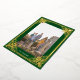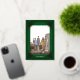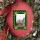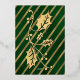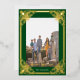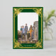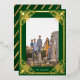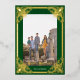 Your photo and family name decorated with a fancy gold frame on a pine forest green background. The background has green and gold diagonal stripes with gold holly. Photo Credit: Photography © Storytree Studios, Stanford, CA
