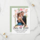 Romantic and chic Save the Date card features your couple's photograph surrounded by a sleek and modern gold frame. Blush pink roses, rosy pink roses and creamy apricot roses embellish the frame. Save the date is written below in a flowing script. Your names are written in a modern font with the date and location below. Formal invitation to follow completes the text. All of the text is editable. You can also change the size, font and colour. The back of the Save the Date card is a soft sage green to complement the roses. Look closely and you'll see just the hint of a floral pattern.