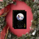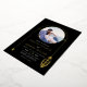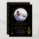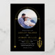 An elegant wedding invitation made of exquisite gold foil that features the couple's photo positioned against a dark background. This modern invitation presents your photo and text in a captivating frame resembling delicate wire jewellery, complemented by a leaf detail on one side and an arrow on the other. The backside displays a diagonal pattern of the couple's names in gold on black, adding a sophisticated touch of grace.