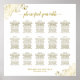 This wedding seating chart includes table assignments for 150 guests at 15 tables. The design is simple yet elegant featuring gold text on a white background. The title is written in lacy script calligraphy and there are faux foil frilly floral decorations in the corners. Stylish, chic and sophisticated way to help your guests find their seats at your reception.