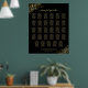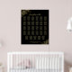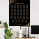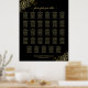 This beautiful wedding seating chart features a simple yet elegant design with gold text on a black background. There are fancy gold faux foil frills or floral filigree in the corners and a script calligraphy title reading "please find your table." The chart has table assignments for 290 guests at 29 tables (10 seats per table.)