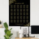This beautiful wedding seating chart features a simple yet elegant design with a black background, gold faux foil frills or floral filigree in the corners and a script calligraphy title reading "please find your table." The chart has table assignments for 300 guests at 30 tables (10 seats per table.)