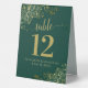 These beautiful table tent signs will make it easy for your guests to find their tables at your wedding reception. The elegant emerald green and gold design features lacy script calligraphy with ornate floral curls and swirls in the corners. There is space for the names of the couple and the wedding date.