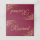 These elegant place cards are designed to let your guests know which seats are reserved for family and other special guests. They feature a maroon or burgundy wine red coloured background with frilly ornate gold faux foil floral accents in the corners, and gold lettering reading "reserved." Perfect for weddings or any other special occasion.