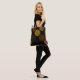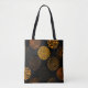 Trendy gold geometric abstract circles pattern over black background. Customisable tote bag template