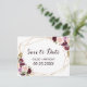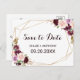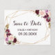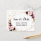 This gold geometric burgundy floral save the date card is perfect for a rustic wedding. The design features elegant green, blush, purple, red and burgundy hand-drawn flower bouquets, adorning gold geometric frames, inspiring class and beauty.