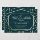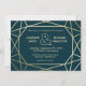 A modern and contemporary winter wedding invitation, features a "faux foil" gold geometric pattern over a dark turquoise background. All your details are spelled in a beautiful modern typo.