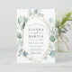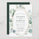 This wedding invitation features painted watercolor eucalyptus and botanical green leaves with a gold geometric frame.