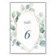 This wedding table number features painted watercolor eucalyptus and botanical green leaves with a gold geometric frame. For more advanced customisation of this design, please click Customise Further link to change font, size, and colour.