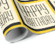 Gold Happy Birthday wrapping paper in a bold geometric pattern.