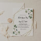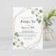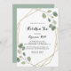 This gold geometric kitchen tea bridal shower invitation is perfect for a rustic wedding shower. The design features hand-drawn botanical green eucalyptus branches and leaves adorning an elegant frame.