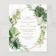 Modern budget wedding invitation featuring a botanical theme with a gold geometric frame surrounded by watercolor painted tropical greenery. This elegant design is perfect for a summer destination wedding in a tropical area. These cheap wedding invitations are printed on sheets of paper for a budget friendly option.