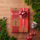 A very stylish and festive modern Christmas wrapping paper, featuring a pattern of gold gift boxes with large bows on top, in a pattern over a bright, metallic red background.