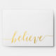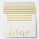 Use this Gold Glam Believe Holiday Printed Envelope to send out the matching holiday cards in our store. Gold Glam Believe | Holiday Photo Cards. Elke Clarke © Printed gold foil effect on a matte surface. Gold and white striped pattern on inside.