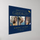 Modern graduation welcome board, featuring a 3 photos, gold glitter, text that reads congratulations to our 'graduate', the graduates name, school or college name and the graduation year. The editable text font styles, sizes and colours can be changed by clicking on the customise further link after personalising.