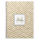 Personalised spiral notebook features elegant gold glitter chevron pattern with custom name in black handwriting font and monogram in matching gold shade in white square frame.