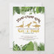 stomp your feet and give a ROAR it's a dinosaur party! Design features an editable "stomp chomp roar" and gold glitter dinosaur surrounded by tropical green forest leaves.
