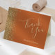 This elegant modern wedding thank you card features a border of gold faux glitter on a burnt orange background. The customisable text combines the words "Thank You" in pale gold-coloured handwriting script and the names of the bride and groom in italic font.