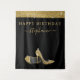 Elegant and Chic Modern Gold and Black Happy Birthday Photo Backdrop Selfie Background Tapestry Banner with Faux Glitter Yellow Gold High Heel Stiletto Shoes and personalised calligraphy script signature.
