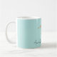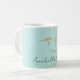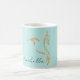 This custom coffee mug features a hummingbird design on a soft teal coloured background. A beautiful hummingbird is printed across the centre, with a sample name printed beside is in an elegant script font. The outline of the bird is printed in a gold glitter style pattern.