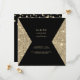 Gold Glitter Image and Black Envelope Style Square. Photo Wedding Save the Date. Back with Bride and Groom Photo last names. Gold Glitter confetti. Website. Black and white filter applied to photo.
