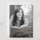 A modern graduation invitation featuring a photo of your grad with gold glitter look script lettering and confetti. The back can be used as an invitation to a graduation party, or cleared to use just as an announcement.