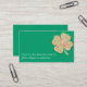 This custom business card features a lucky four leaf clover design on an Irish green background. The front of the business card features an image of a good luck four leaf clover with a gold glitter design and shiny looking green foil border. The business name and slogan are printed beside it, with the contact information printed on the back.