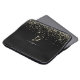 A trendy design of gold glitter with gold monogram and white script name on black background.