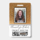 Faux gold glitter sparkles delightfully behind a photo template with black and white frame. Easily update the name and professional job title for each custom employee badge. There is also space for a company logo—delete to leave blank. Backside features more faux glitter and an image template perfect for employee bar codes. Available in many other styles and colours.
