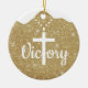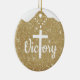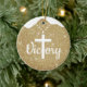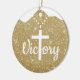 Gold Glitter Religious Holiday Decoration, an ideal Xmas gift for sharing faith and joy. The front displays the elegant white cursive word "Victory," with a majestic large Cross on a beaded necklace substituting the letter T, all set against a Golden shimmering background that evokes a festive winter sparkle. On the back, the same background features the profound Bible verse John 3:16: "For God so loved the world, that he gave his only begotten Son, that whosoever believeth in him should not perish, but have everlasting life," in white customizable text for a truly personal devotional touch. This hanging Christmas ornament captures the essence of holy spirit, worship, and inspirational Jesus teachings from the testaments, serving as a sacred writing present tag. As a custom keepsake embodying doctrine, divine passages, and the word of our Lord, it's perfect for Christian decor during the holiday season. Editable and personalizable elements allow you to tailor this uplifting design to your heart's desire. Plus, transfer this versatile sacred motif to your choice of many products on Zazzle, from mugs to apparel, for endless inspirational options. Customize your Christ heirloom now and spread divine light this season!